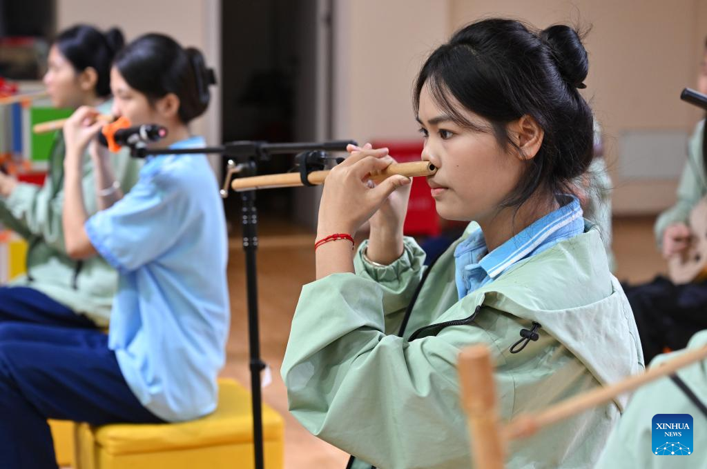 Students practice nose flute, one of the wood and bamboo instruments of the Li ethnic group, at Hainan Minzu Technical School in Wuzhishan City, south China's Hainan Province, June 12, 2025. In recent years, Wuzhishan city has launched a project to introduce intangible cultural heritage into campuses, offering related courses in 14 public primary and secondary schools to cultivate teenagers' interest for traditional culture and promote the inheritance and development of intangible cultural heritage. (Xinhua/Guo Cheng)