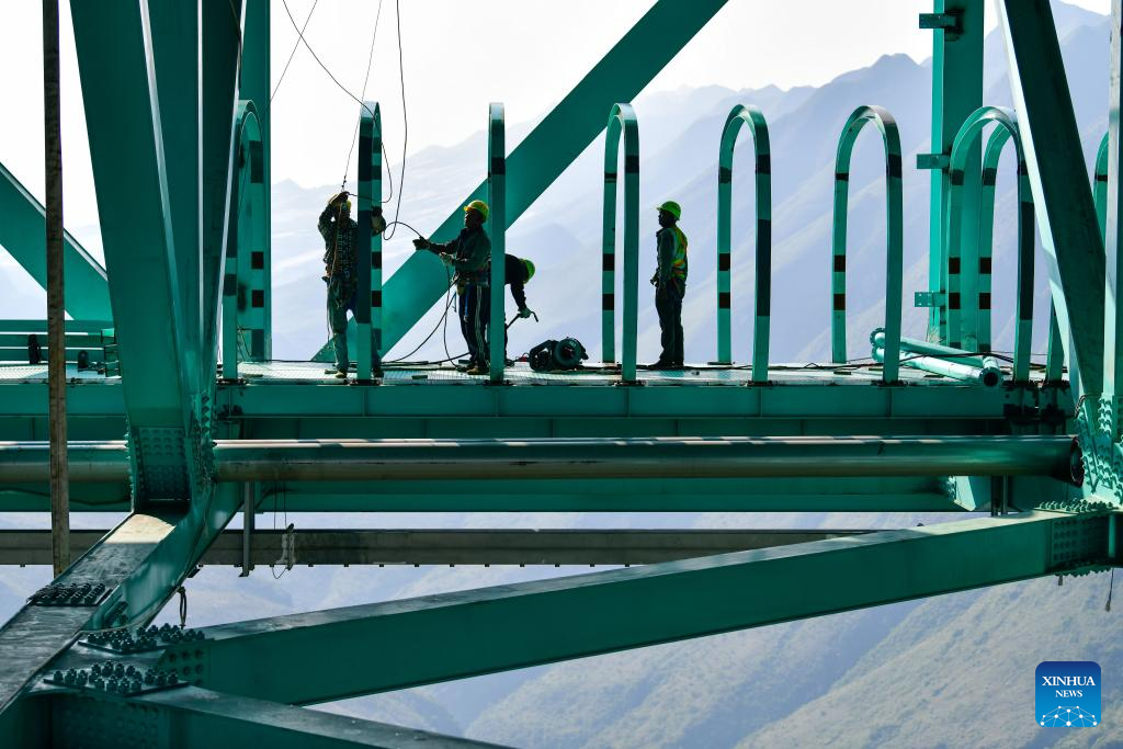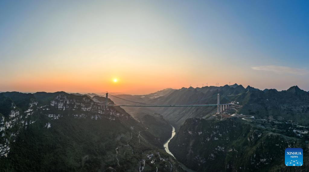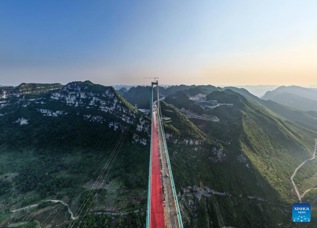 The suspension bridge has a vertical height of 625 meters from the bridge deck down to the river surface -- roughly twice the height of the Eiffel Tower. The 2,890-meter bridge, with a span of 1,420 meters, is also the world's largest span bridge to be built in a mountainous area. It is expected to open to traffic this year. (Xinhua/Yang Wenbin)