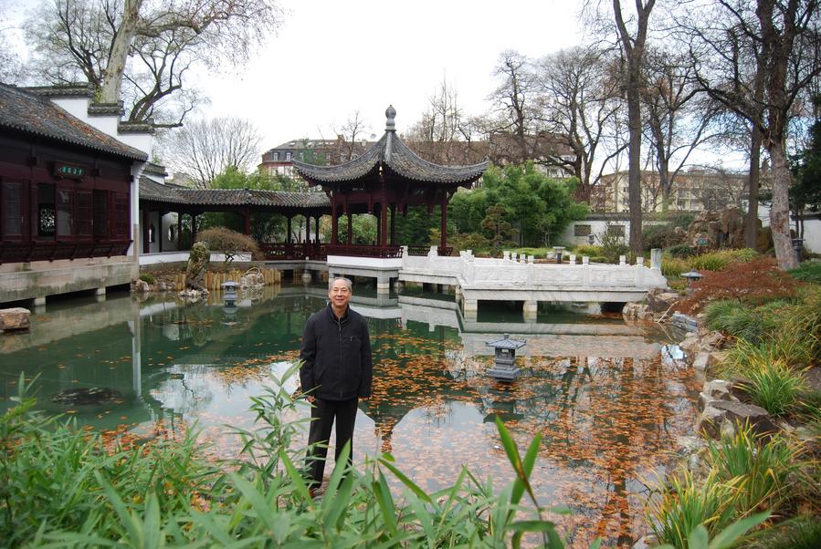 This file photo taken in October 2007 shows Cheng Jiyue, an expert on Hui-style architecture, stands at the site of the overall maintenance and improvement project of Chunhua Garden in Frankfurt, Germany. (Xinhua)