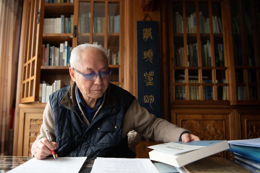 Cheng Jiyue, an expert on Hui-style architecture, writes about traditional Huizhou architecture at home in Tunxi District of Huangshan City, east China's Anhui Province, on April 2, 2025. (Xinhua/Zhang Duan)