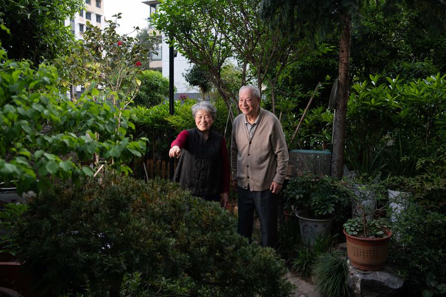 Cheng Jiyue (R), an expert on Hui-style architecture, and his wife Tong Jianying are pictured in a courtyard at home in Tunxi District of Huangshan City, east China's Anhui Province, on April 10, 2025. (Xinhua/Zhang Duan)
