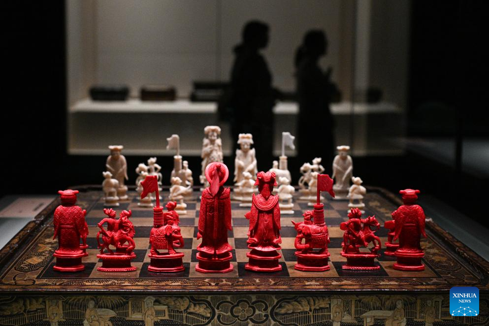 This photo taken on June 12, 2025 shows a carved ivory chess set displayed at the China (Hainan) Museum of the South China Sea in Qionghai, south China's Hainan Province. A great number of exhibits relevant to the Maritime Silk Road are showcased at the China (Hainan) Museum of the South China Sea, providing valuable insights into the prosperity of the Maritime Silk Road in ancient China and the exchanges between Chinese and foreign civilizations. (Xinhua/Pu Xiaoxu)