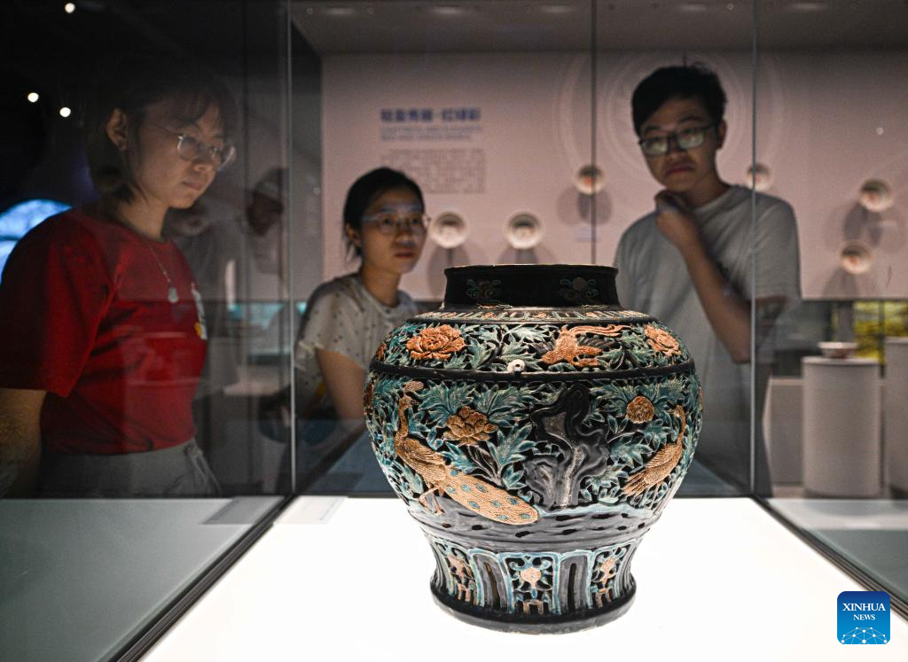 Visitors look at a jar displayed at the China (Hainan) Museum of the South China Sea in Qionghai, south China's Hainan Province, June 12, 2025. A great number of exhibits relevant to the Maritime Silk Road are showcased at the China (Hainan) Museum of the South China Sea, providing valuable insights into the prosperity of the Maritime Silk Road in ancient China and the exchanges between Chinese and foreign civilizations. (Xinhua/Pu Xiaoxu)