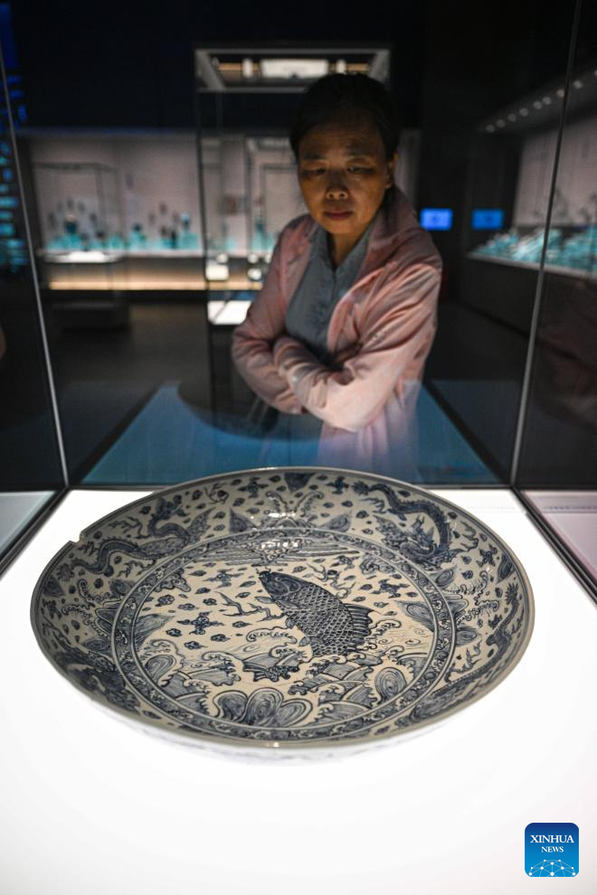 This photo taken on June 10, 2025 shows blue and white porcelain works displayed at the China (Hainan) Museum of the South China Sea in Qionghai, south China's Hainan Province. A great number of exhibits relevant to the Maritime Silk Road are showcased at the China (Hainan) Museum of the South China Sea, providing valuable insights into the prosperity of the Maritime Silk Road in ancient China and the exchanges between Chinese and foreign civilizations. (Xinhua/Pu Xiaoxu)