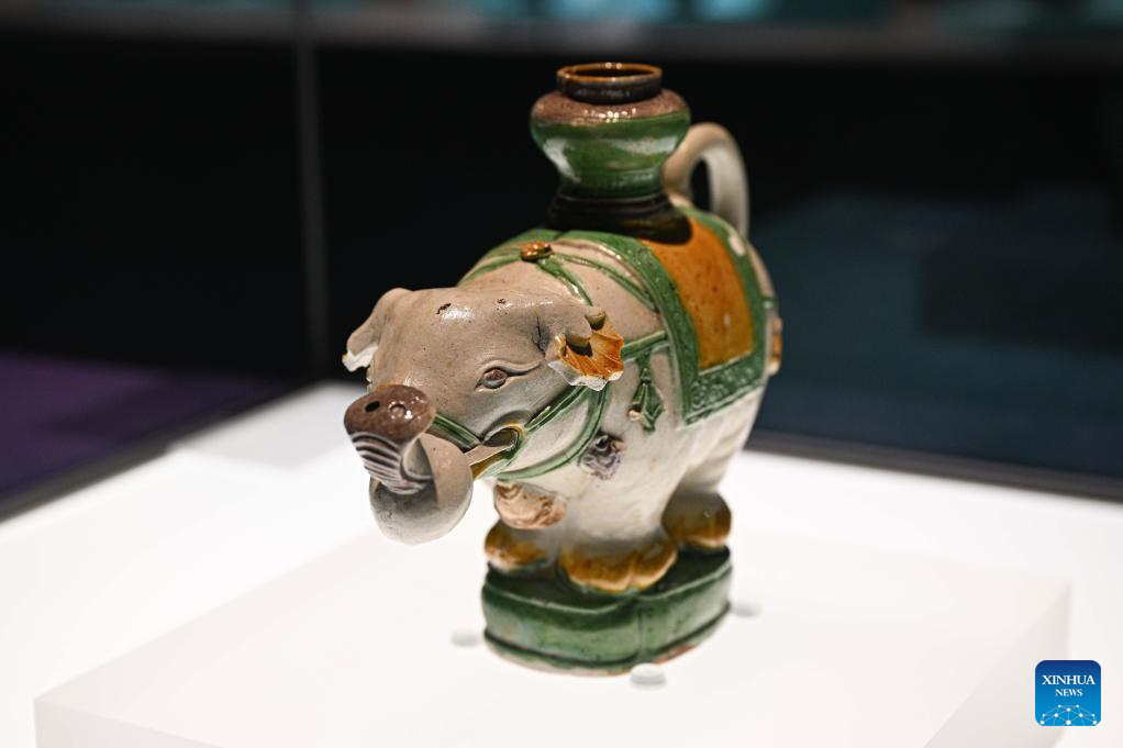 This photo taken on June 10, 2025 shows an elephant-shaped pot displayed at the China (Hainan) Museum of the South China Sea in Qionghai, south China's Hainan Province. A great number of exhibits relevant to the Maritime Silk Road are showcased at the China (Hainan) Museum of the South China Sea, providing valuable insights into the prosperity of the Maritime Silk Road in ancient China and the exchanges between Chinese and foreign civilizations. (Xinhua/Pu Xiaoxu)