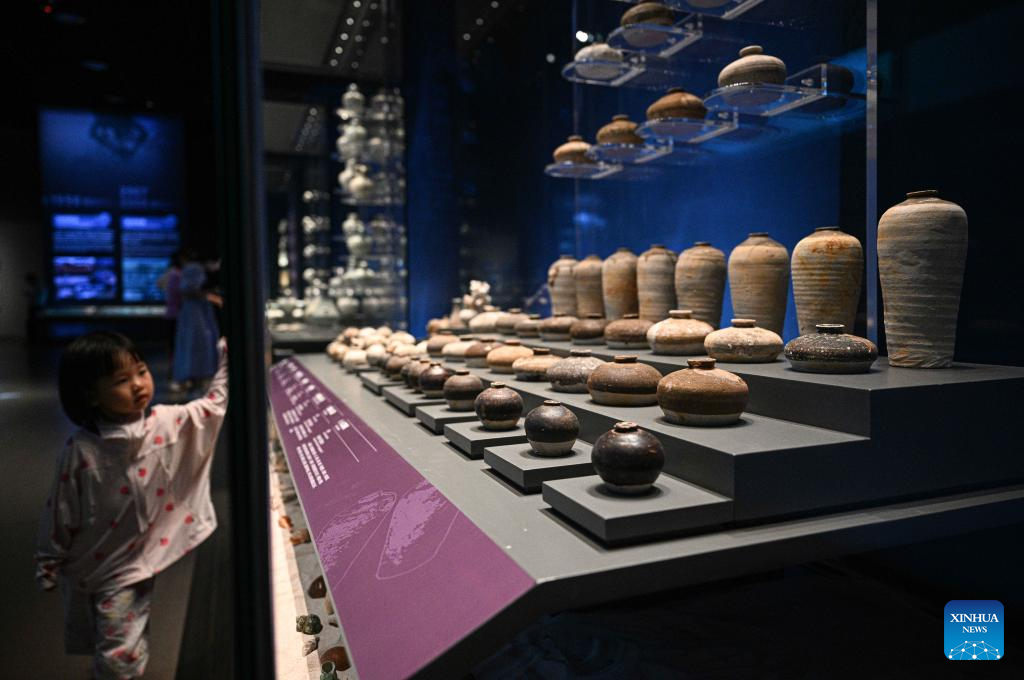 This photo taken on June 12, 2025 shows ceramics displayed at the China (Hainan) Museum of the South China Sea in Qionghai, south China's Hainan Province. A great number of exhibits relevant to the Maritime Silk Road are showcased at the China (Hainan) Museum of the South China Sea, providing valuable insights into the prosperity of the Maritime Silk Road in ancient China and the exchanges between Chinese and foreign civilizations. (Xinhua/Pu Xiaoxu)