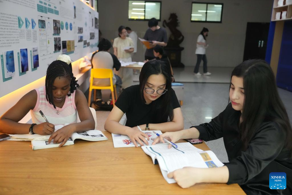 Ekpene Mabel Solomon (1st L) studies with her schoolmates at Changsha Medical University in Changsha, central China's Hunan Province, June 10, 2025. (Xinhua/Xue Yuge)