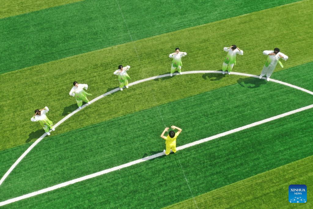An aerial drone photo shows Ekpene Mabel Solomon (1st L) practicing Baduanjin, a traditional form of Chinese aerobic exercise known for its health benefits, with other students at Changsha Medical University in Changsha, central China's Hunan Province, May 29, 2025. (Xinhua/Xue Yuge)