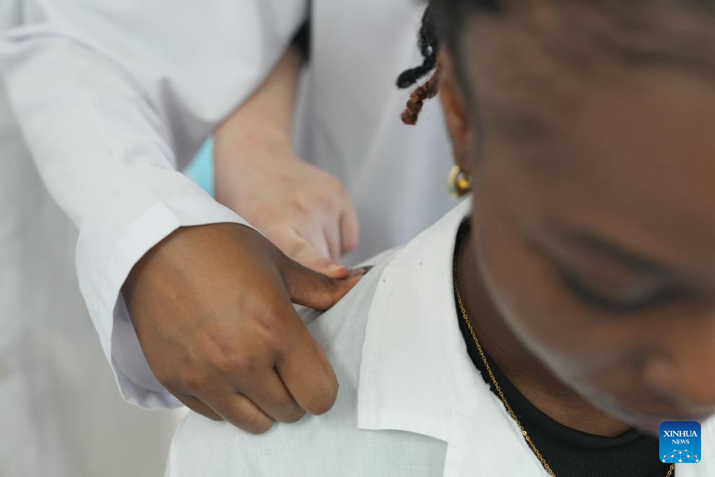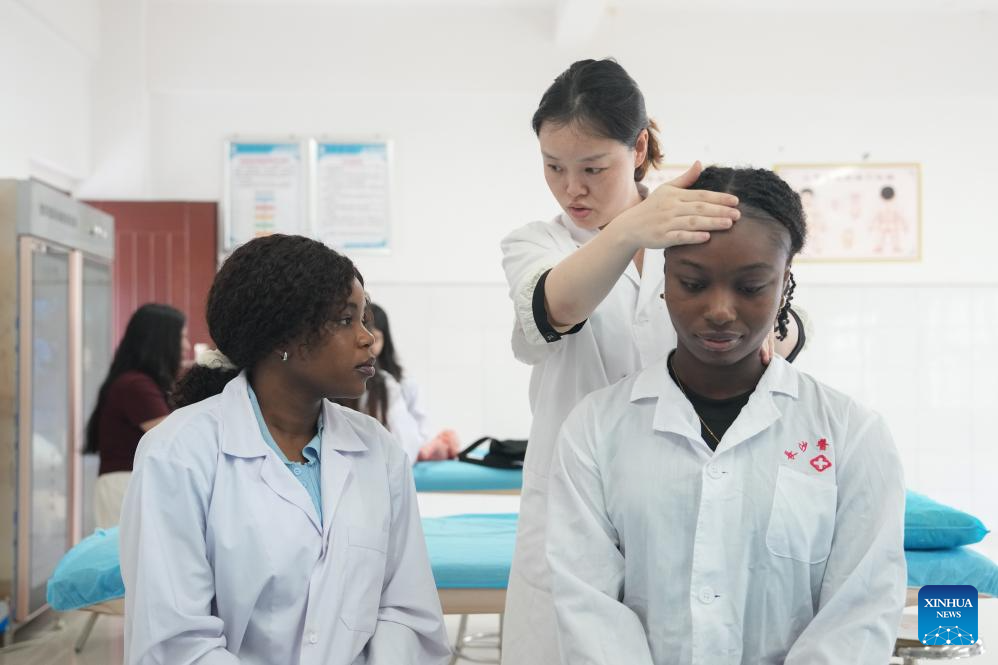 Ekpene Mabel Solomon practices tuina massage under the guidance of her teacher at Changsha Medical University in Changsha, central China's Hunan Province, May 29, 2025. (Xinhua/Xue Yuge)