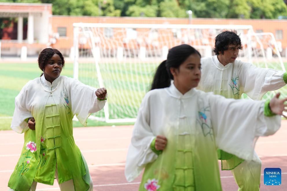 Ekpene Mabel Solomon (3rd R) practices Baduanjin, a traditional form of Chinese aerobic exercise known for its health benefits, with other students at Changsha Medical University in Changsha, central China's Hunan Province, May 29, 2025. (Xinhua/Xue Yuge)