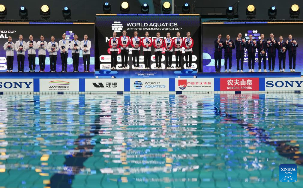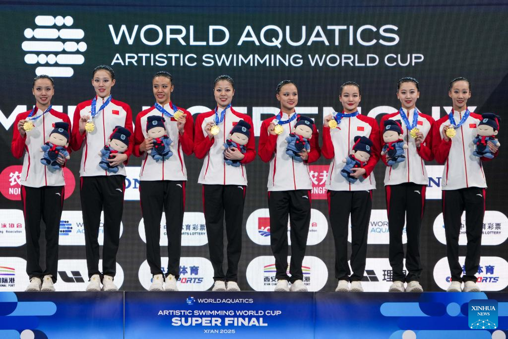 Gold medalists Team China pose on the podium during the awarding ceremony of the team free event at the World Aquatics Artistic Swimming World Cup 2025-Super Final in Xi'an, northwest China's Shaanxi Province, June 14, 2025. (Xinhua/Zou Jingyi)