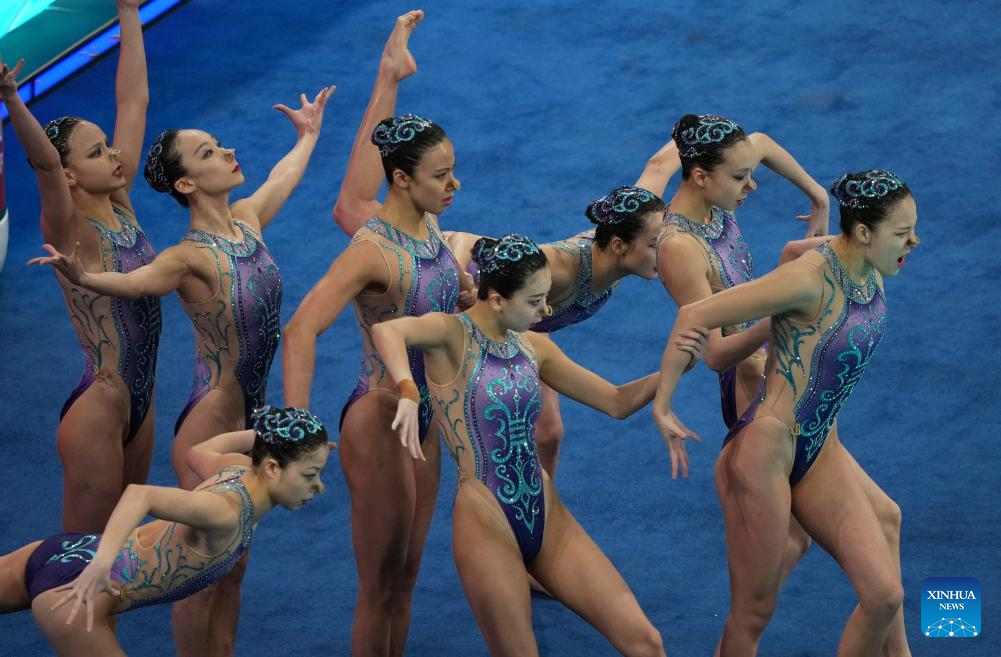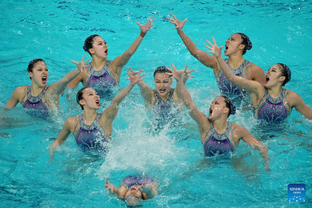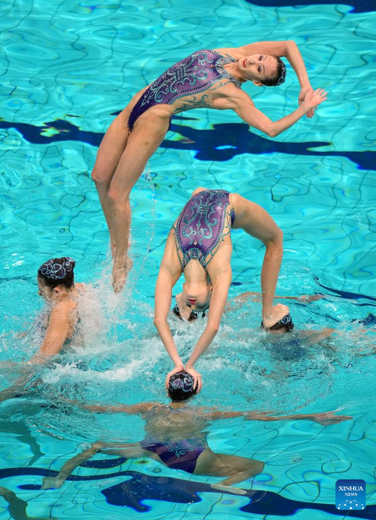 Team China perform during the team free event at the World Aquatics Artistic Swimming World Cup 2025-Super Final in Xi'an, northwest China's Shaanxi Province,June 14, 2025. (Xinhua/Zou Jingyi)