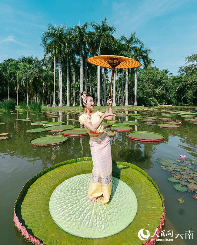 A woman of the Dai ethnic group dances on the leaf of the Victoria amazonica. (People's Daily Online/Zha Wei)