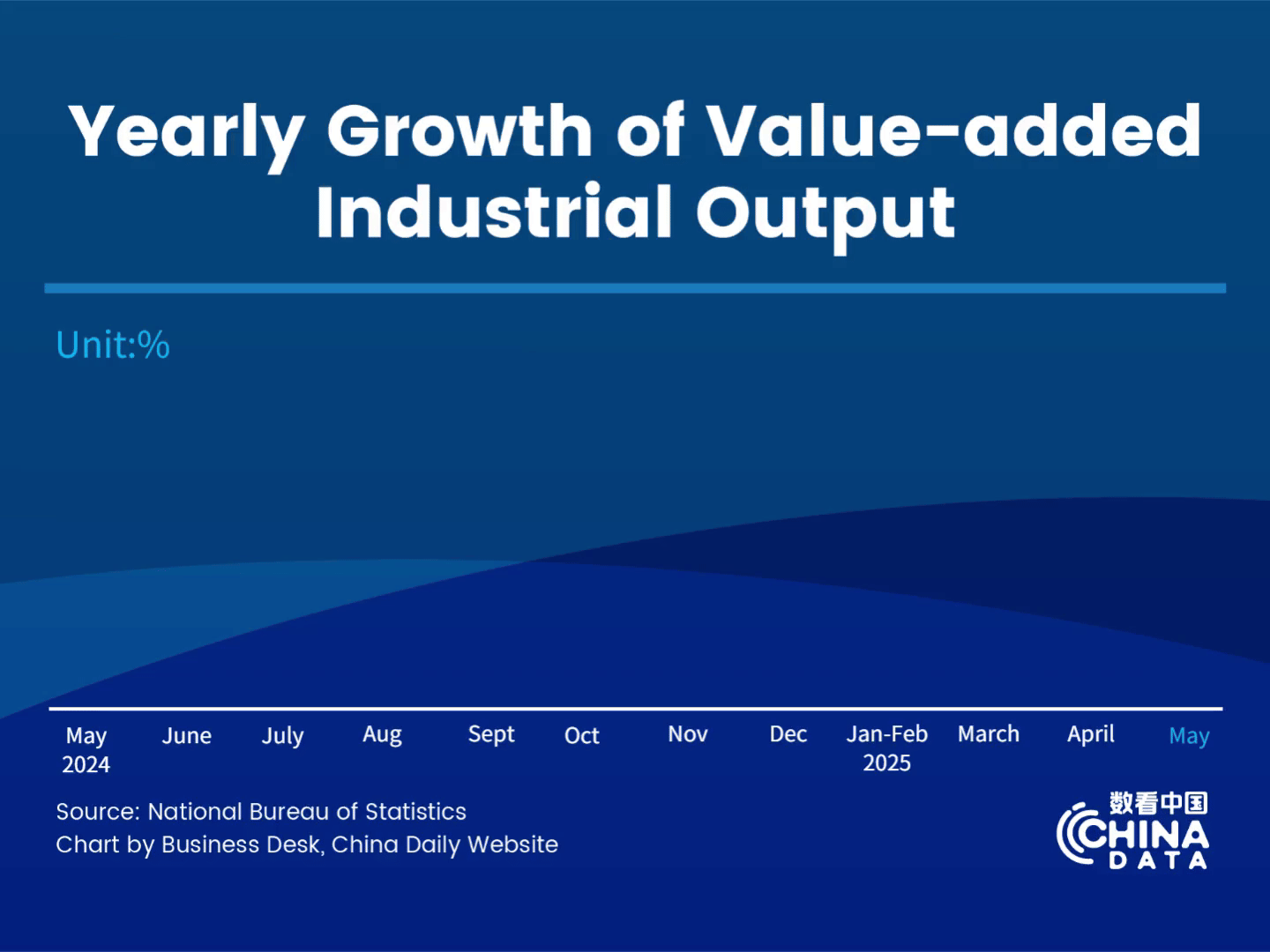 China's value-added industrial output, an important economic indicator, went up 5.8 percent year-on-year in May, said the bureau.