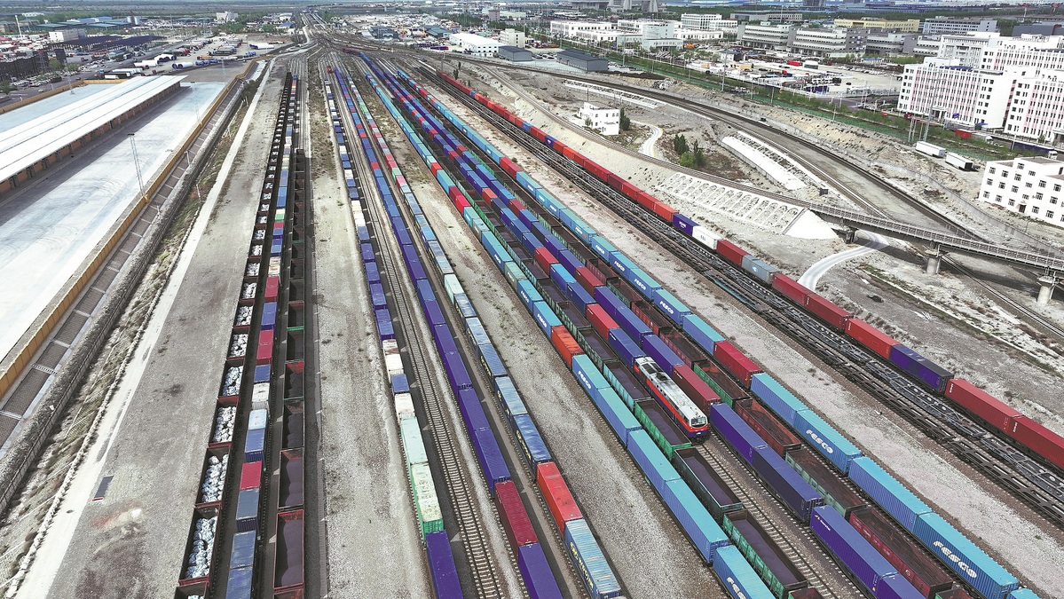 Freight trains arriving in Horgos, Xinjiang Uygur autonomous region, from Kazakhstan wait at a depot on April 24. The cargo is reloaded onto standard-gauge trains for transportation to their destinations in China. ZOU HONG/CHINA DAILY