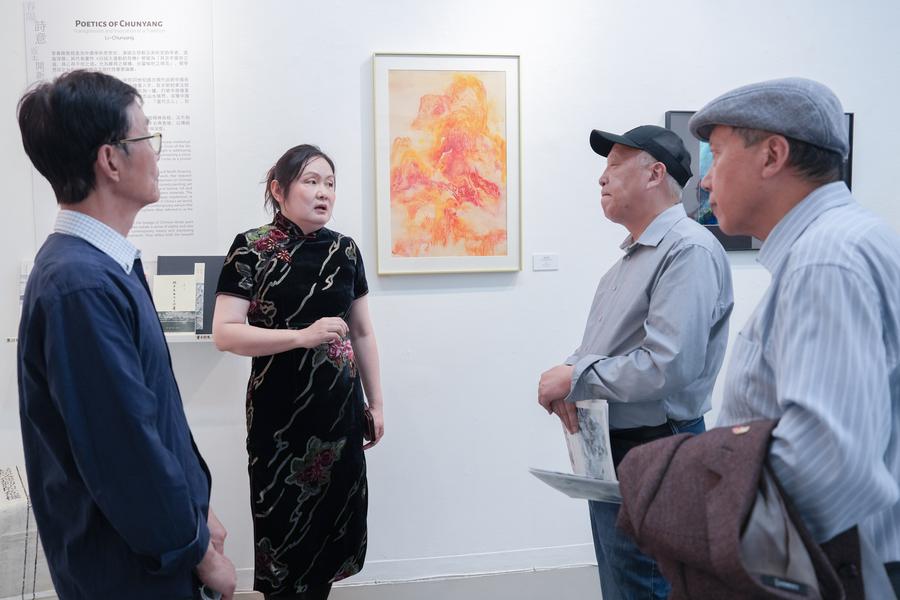 Chinese artist Li Chunyang (2nd L) talks with New York City-based artists at the opening ceremony of her exhibition titled "Poetics of Chunyang: Transgression and Invocation of A Tradition" at the 456 Gallery in New York, the United States, on June 13, 2025. (Photo by Zack Zhang/Xinhua)