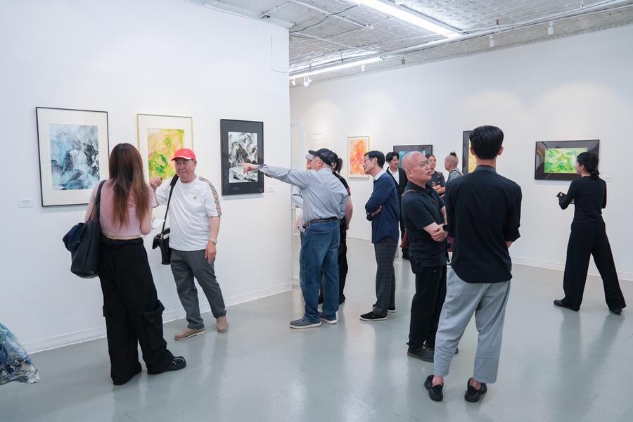 Guests converse amid the works of Chinese artist Li Chunyang during the opening night of her exhibition titled "Poetics of Chunyang: Transgression and Invocation of A Tradition" at the 456 Gallery in New York, the United States, on June 13, 2025. (Photo by Zack Zhang/Xinhua)