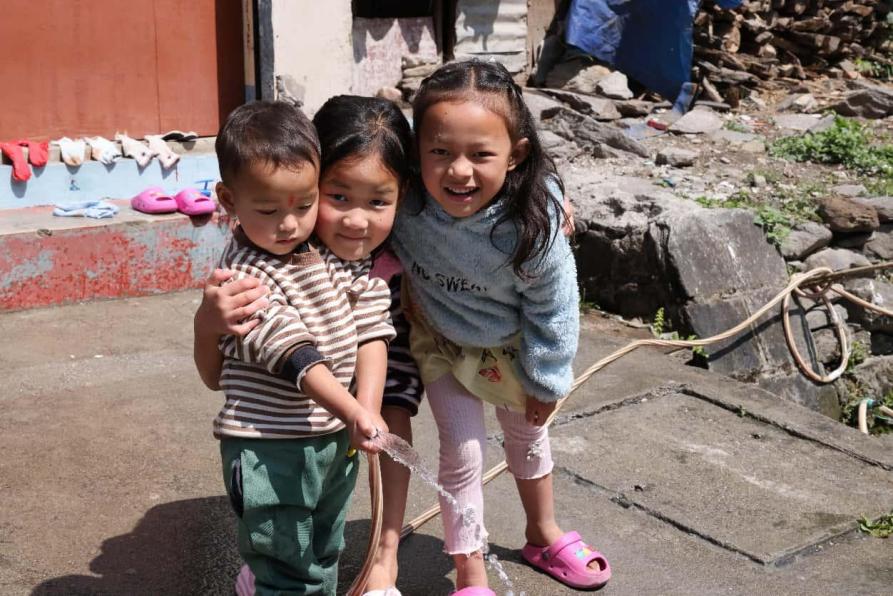 Children from Tatopani village in Nepal pose for a picture. (Photo by Zhang Bolan/People's Daily)