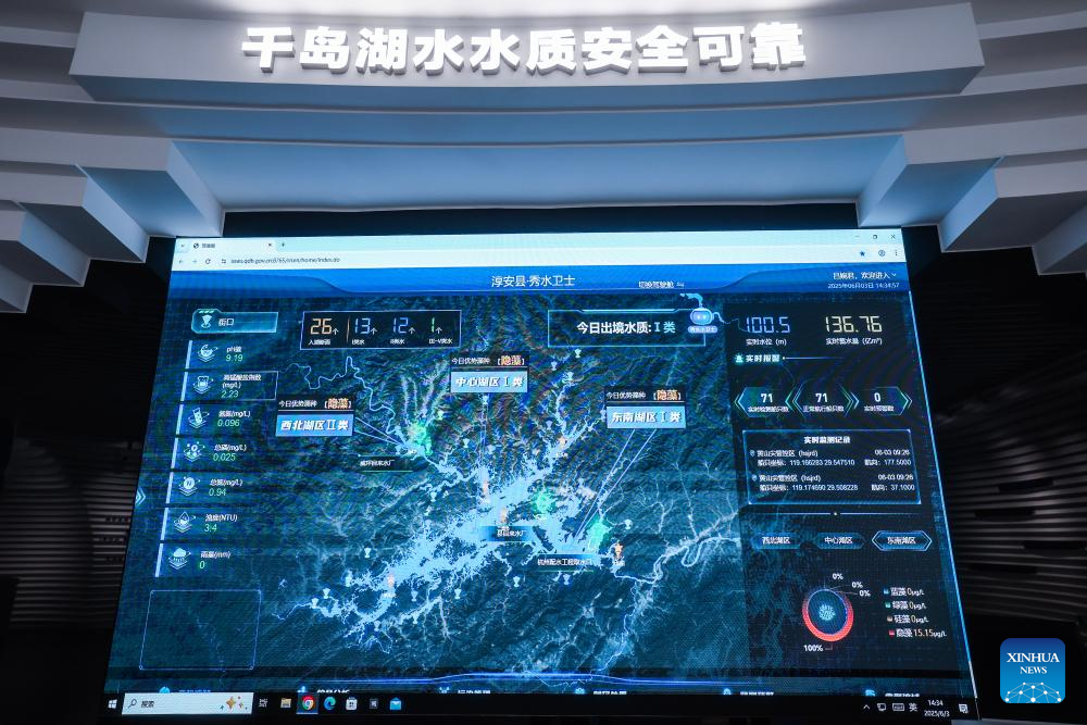 This photo taken on June 3, 2025 shows a real-time water quality display of the Qiandao Lake in east China's Zhejiang Province. Chun'an, located in east China's Zhejiang Province, is renowned for its water system and outstanding natural environment. As a national-level ecological county, it serves as a model for ecological protection and construction. (Xinhua/Xu Yu)