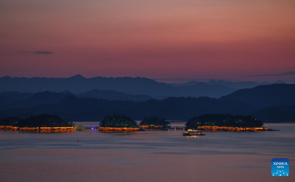 This photo taken on June 3, 2025 shows a sunset view of the Qiandao Lake in east China's Zhejiang Province. Chun'an, located in east China's Zhejiang Province, is renowned for its water system and outstanding natural environment. As a national-level ecological county, it serves as a model for ecological protection and construction. (Xinhua/Xu Yu)
