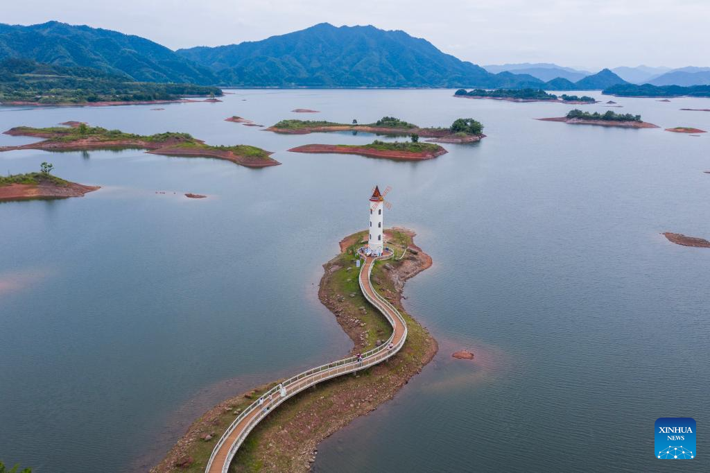 An aerial drone photo taken on June 3, 2025 shows a lighthouse in Chun'an County, east China's Zhejiang Province. Chun'an, located in east China's Zhejiang Province, is renowned for its water system and outstanding natural environment. As a national-level ecological county, it serves as a model for ecological protection and construction. (Xinhua/Xu Yu)