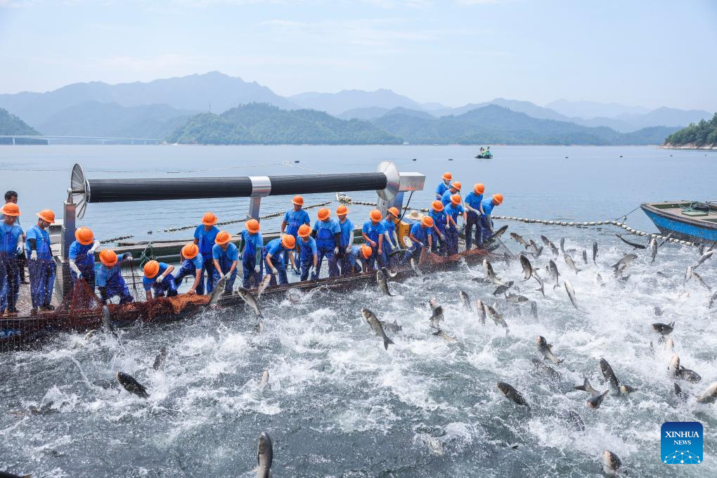 Staff members catch fish on the Qiandao Lake in east China's Zhejiang Province, June 4, 2025. Chun'an, located in east China's Zhejiang Province, is renowned for its water system and outstanding natural environment. As a national-level ecological county, it serves as a model for ecological protection and construction. (Xinhua/Xu Yu)