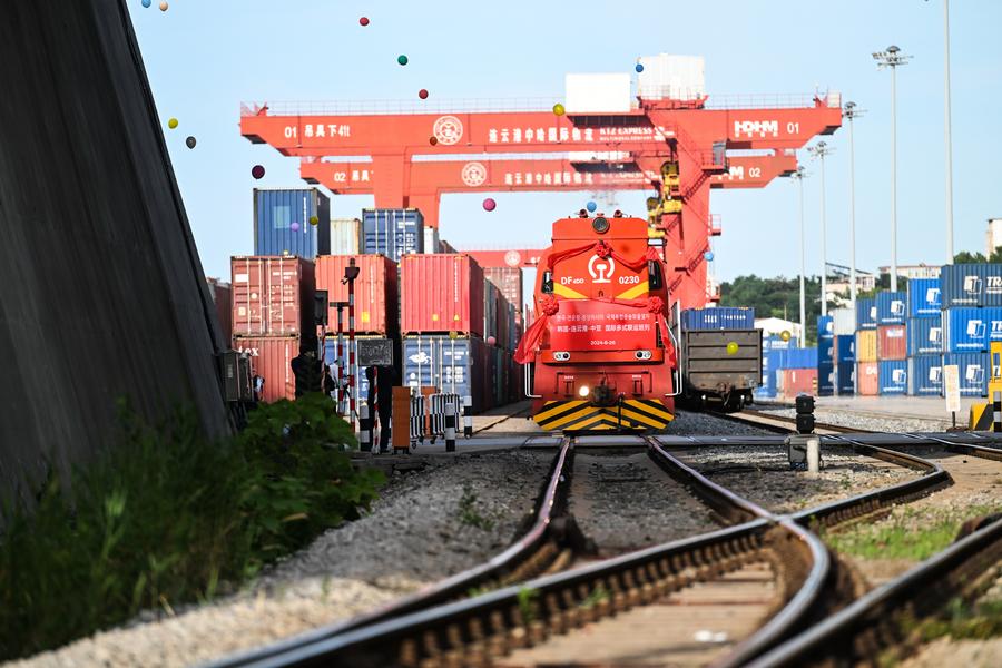 An international freight train pulls out of the China-Kazakhstan (Lianyungang) Logistics Cooperation Base in Lianyungang, east China's Jiangsu Province on June 26, 2024. (Xinhua/Ji Chunpeng)