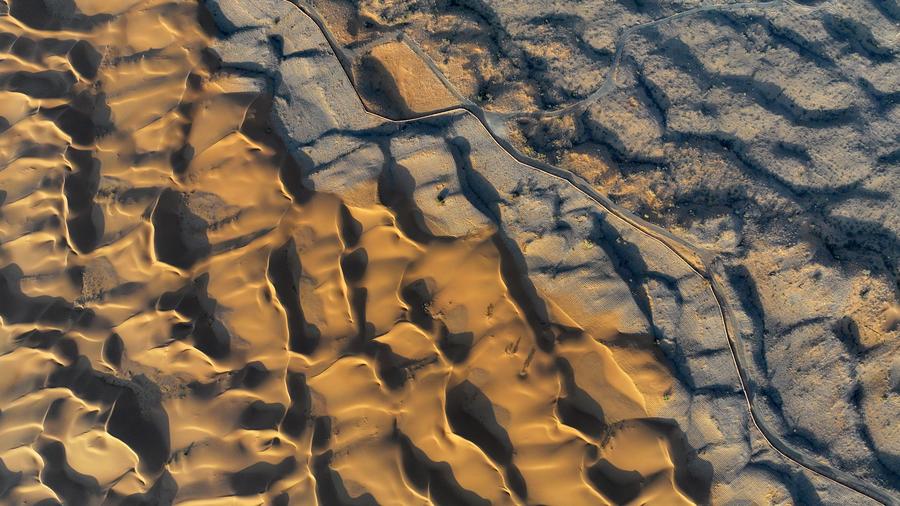 The green belt protecting this vital transport artery stands as a near-miracle in the arid landscape. Over the past 60 years, massive human efforts have been mobilized in Zhongwei City, in northwest China's Ningxia Hui Autonomous Region, to create "straw checkerboard," a dune stabilization technique where straw is laid out in a checkerboard pattern on the desert surface. These grids have provided a foundation for vegetation to take root and gradually transform the sand into green.
