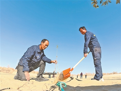 Tian Ye (left), a 50-year-old Chinese veteran, plants trees with his teammate in a desert in Qiemo county, Bayingolin Mongolian autonomous prefecture, northwest China's Xinjiang Uygur Autonomous Region. (Photo/Su Xin)