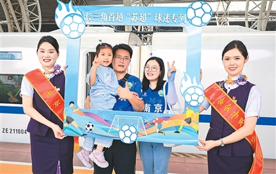 Passengers pose for a photo in front of the first high-speed train in the Yangtze River Delta dedicated to the "Su Super League" between Nanjing and Huai'an in east China's Jiangsu Province, on June 14, 2025. (Xinhua/Su Yang)