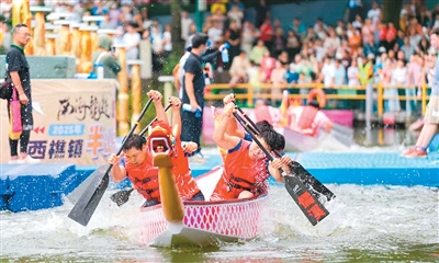 People participate in a dragon boat race in Xiqiao town, Foshan city, south China's Guangdong Province. (Photo courtesy of the Foshan Municipal Bureau of Culture, Radio, Television, Tourism, and Sports)