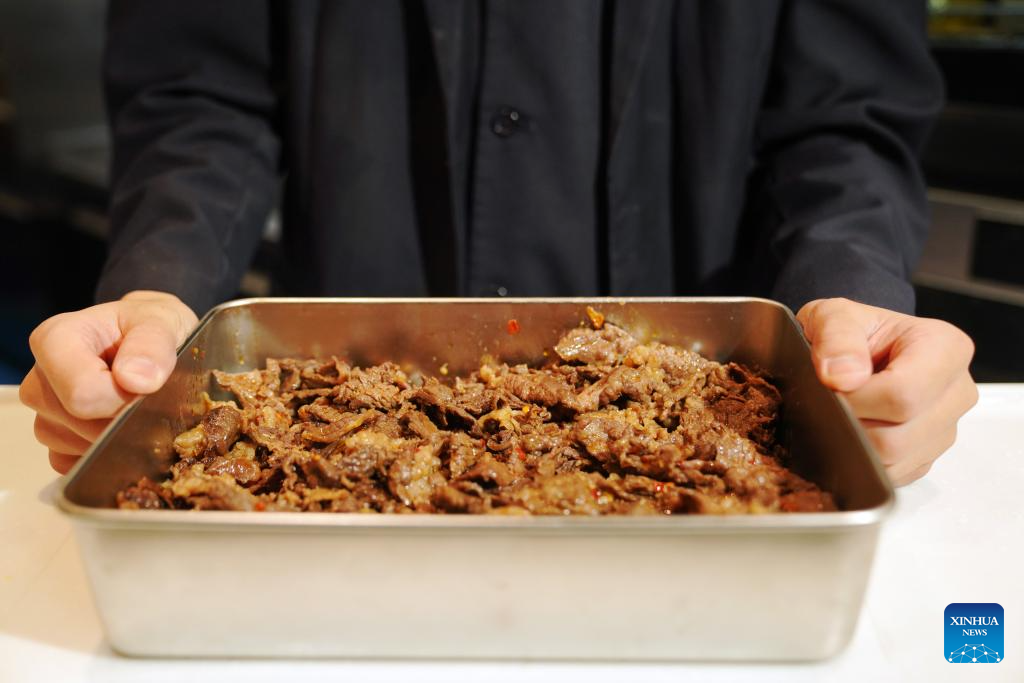 Stewards show prepared raw meat for making Qiqihar barbecue on train D6993 in northeast China's Heilongjiang Province, June 18, 2025. A Qiqihar barbecue cultural experiencing event was held Wednesday on bullet train D6993 running from Harbin West Railway Station to Qiqihar South Railway Station in Heilongjiang Province, offering a rich travel experience to passengers during the journey. (Xinhua/Wang Song)