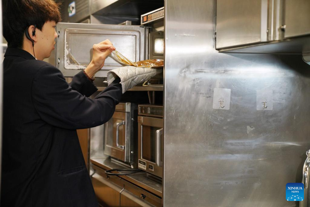 A steward heats Qiqihar barbecue on train D6993 in northeast China's Heilongjiang Province, June 18, 2025. A Qiqihar barbecue cultural experiencing event was held Wednesday on bullet train D6993 running from Harbin West Railway Station to Qiqihar South Railway Station in Heilongjiang Province, offering a rich travel experience to passengers during the journey. (Xinhua/Wang Song)