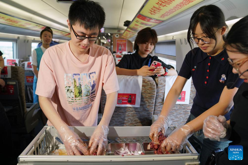 A passenger (L) tries to prepare Qiqihar barbecue on train D6993 in northeast China's Heilongjiang Province, June 18, 2025. A Qiqihar barbecue cultural experiencing event was held Wednesday on bullet train D6993 running from Harbin West Railway Station to Qiqihar South Railway Station in Heilongjiang Province, offering a rich travel experience to passengers during the journey. (Xinhua/Wang Song)