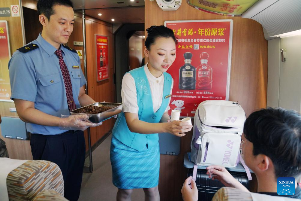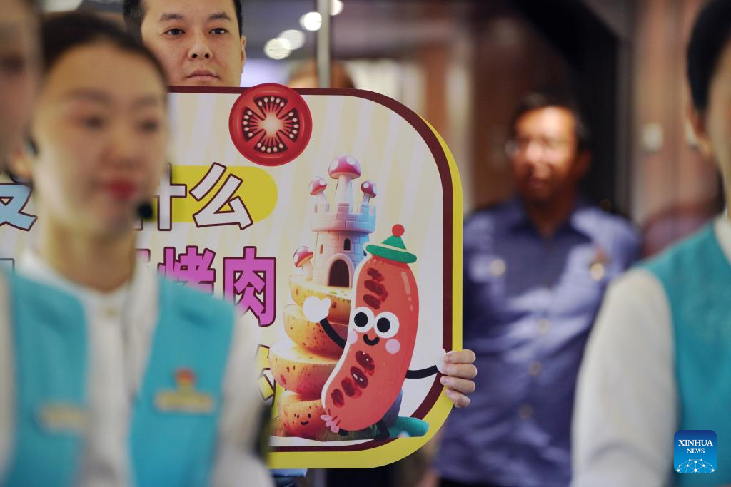 Stewards invite passengers to taste Qiqihar barbecue on train D6993 in northeast China's Heilongjiang Province, June 18, 2025. A Qiqihar barbecue cultural experiencing event was held Wednesday on bullet train D6993 running from Harbin West Railway Station to Qiqihar South Railway Station in Heilongjiang Province, offering a rich travel experience to passengers during the journey. (Xinhua/Wang Song)