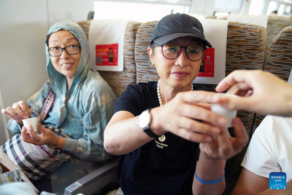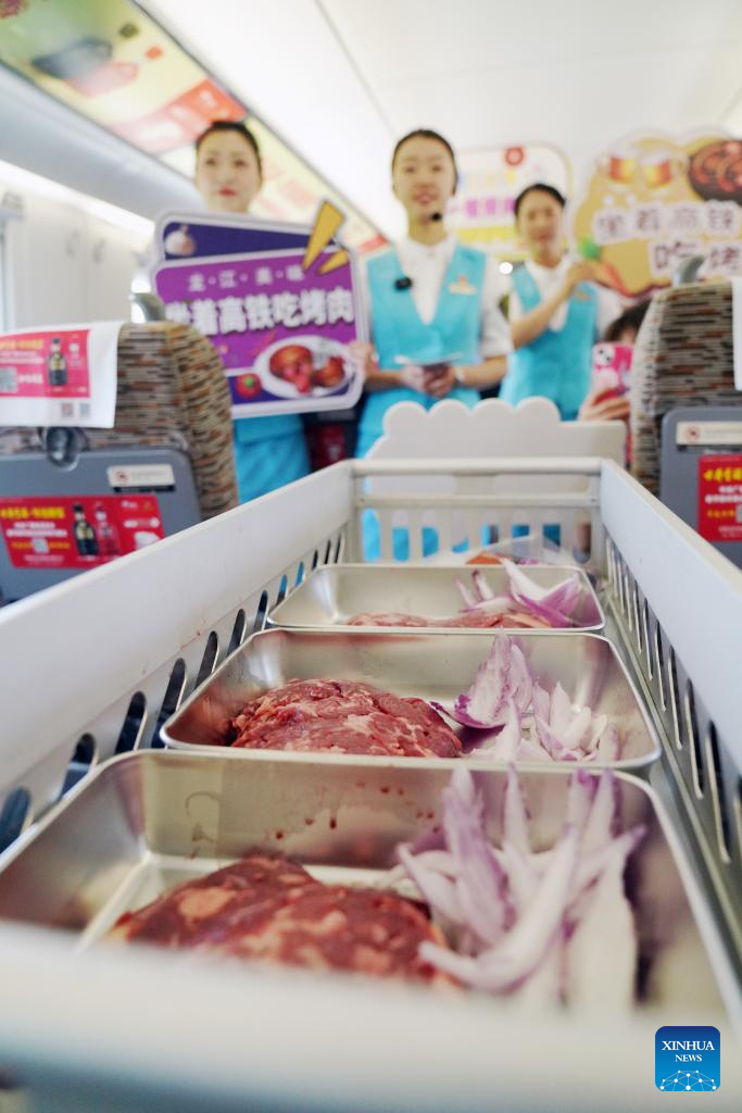 Passengers taste Qiqihar barbecue on train D6993 in northeast China's Heilongjiang Province, June 18, 2025. A Qiqihar barbecue cultural experiencing event was held Wednesday on bullet train D6993 running from Harbin West Railway Station to Qiqihar South Railway Station in Heilongjiang Province, offering a rich travel experience to passengers during the journey. (Xinhua/Wang Song)