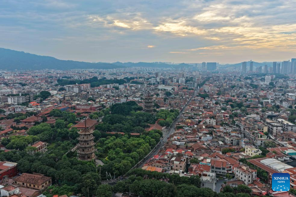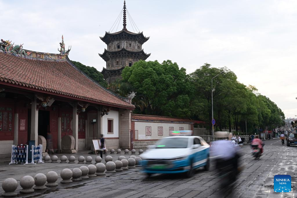 This photo taken on May 21, 2025 shows the Kaiyuan Temple and Xijie, an ancient street area, in Quanzhou, southeast China's Fujian Province. Located along the coastline of southeast China's Fujian Province, Quanzhou was one of the world's largest ports along the historic Maritime Silk Road, particularly in ancient China's Song Dynasty (960-1279) and Yuan Dynasty (1271-1368).