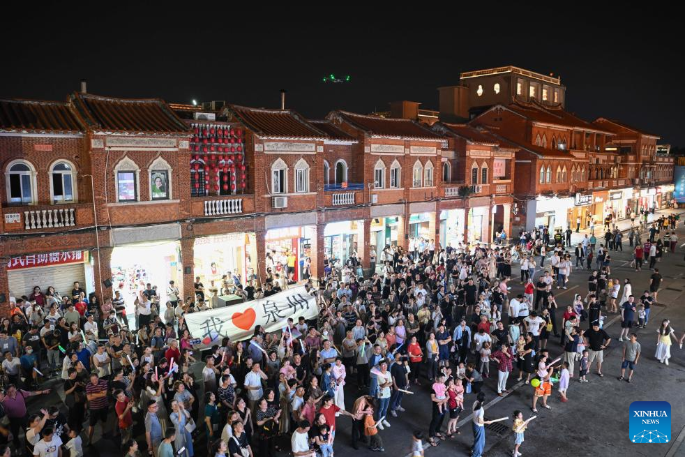Tourists watch a performance at the historical center of Quanzhou, southeast China's Fujian Province, May 20, 2025. Located along the coastline of southeast China's Fujian Province, Quanzhou was one of the world's largest ports along the historic Maritime Silk Road, particularly in ancient China's Song Dynasty (960-1279) and Yuan Dynasty (1271-1368).