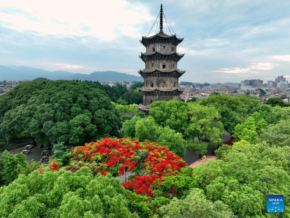 An aerial drone photo taken on May 21, 2025 shows the Zhenguo Pagoda of Kaiyuan Temple in Quanzhou, southeast China's Fujian Province. Located along the coastline of southeast China's Fujian Province, Quanzhou was one of the world's largest ports along the historic Maritime Silk Road, particularly in ancient China's Song Dynasty (960-1279) and Yuan Dynasty (1271-1368).