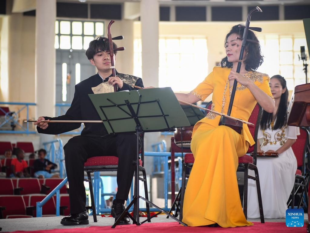Members of a touring troupe from east China's Shandong Normal University perform Chinese folk music during a cultural event at Kenyatta University in Nairobi, Kenya, on June 18, 2025. (Xinhua/Li Yahui)
