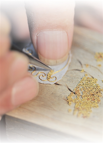 Photo shows a step of filigree art. (Photo courtesy of Pan Miao)