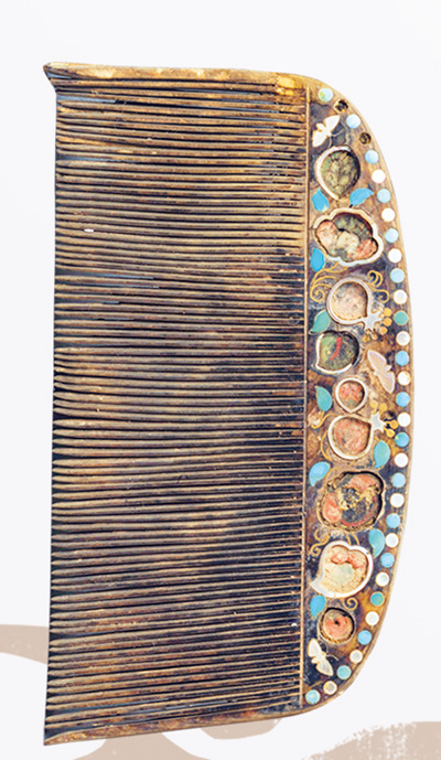 A bone comb inlaid with mother-of-pearl and turquoise from the Tang Dynasty (618-907) housed in the Wuwei Museum, northwest China's Gansu Province. (Photo/Hou Yadan)