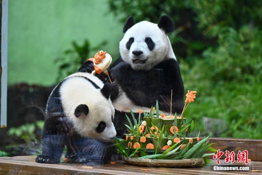 Giant panda Mei Zhu and its mother Meng Meng taste a birthday cake customized for Mei Zhou at Chimelong Safari Park in Guangzhou, China's Guangdong Province, June 18, 2025. (Photo: China News Service/Chen Jimin)
