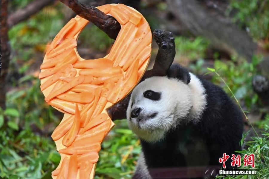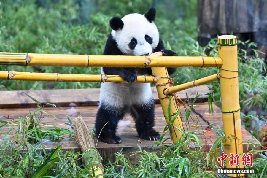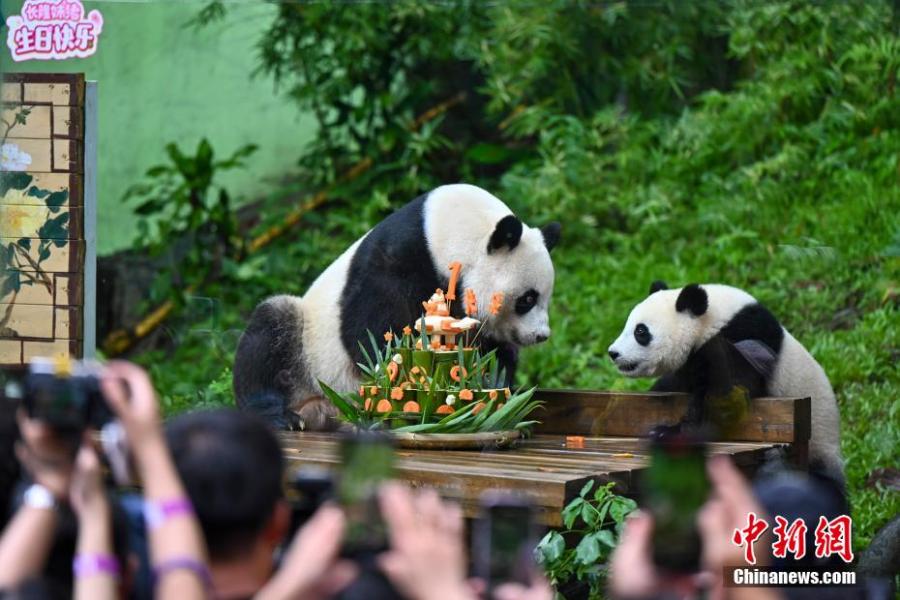Mei Zhu welcomed its first birthday on Wednesday. It was born at Chimelong Safari Park on June 18, 2024 to mother Meng Meng. Being 178 grams at birth, it has grown to 27.1 kilograms and in good condition.