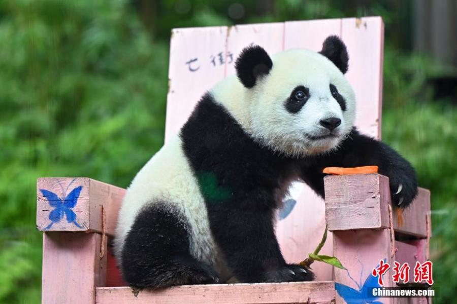 Giant panda Mei Zhu plays on a chair at Chimelong Safari Park in Guangzhou, China's Guangdong Province, June 18, 2025. (Photo: China News Service/Chen Jimin)