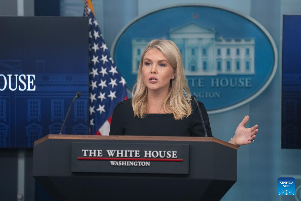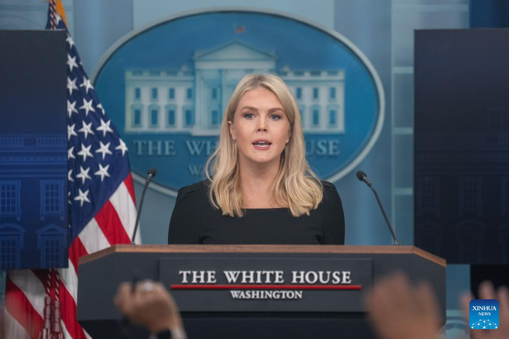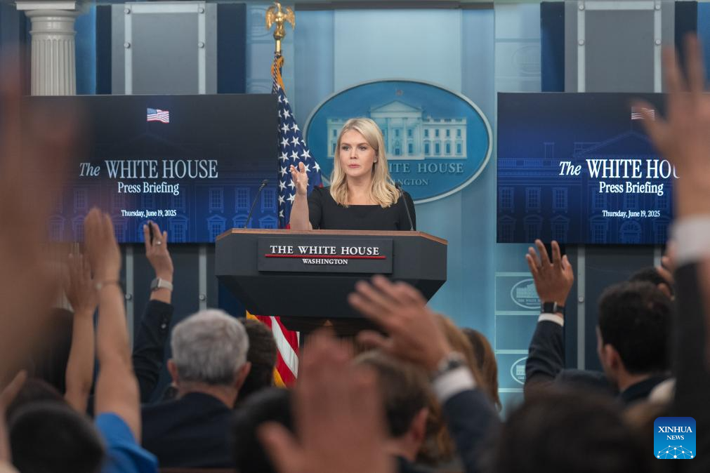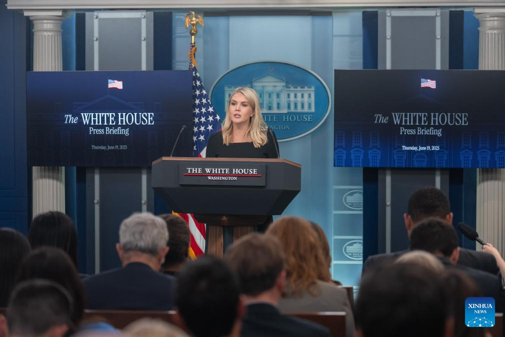 White House Press Secretary Karoline Leavitt speaks during a press briefing at the White House in Washington, D.C., the United States, on June 19, 2025. U.S. President Donald Trump will make a decision on whether he will order a strike against Iran in the next two weeks, White House Press Secretary Karoline Leavitt said at a briefing on Thursday. (Xinhua/Hu Yousong)