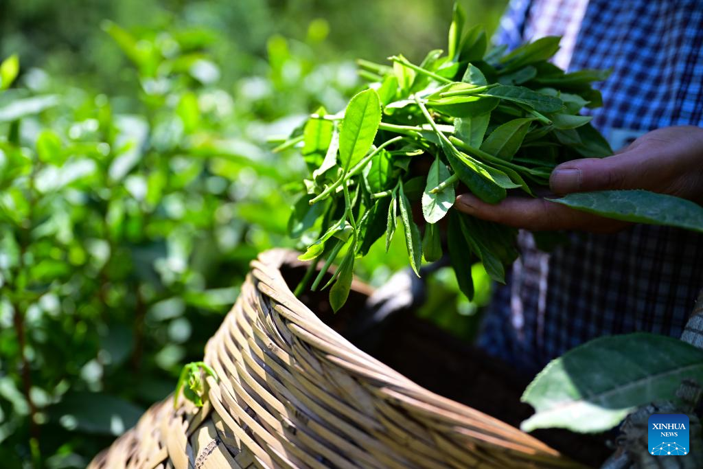 A farmer shows newly-picked tea leaves in Houkeng Village of Huangshan, east China's Anhui Province, April 15, 2025.