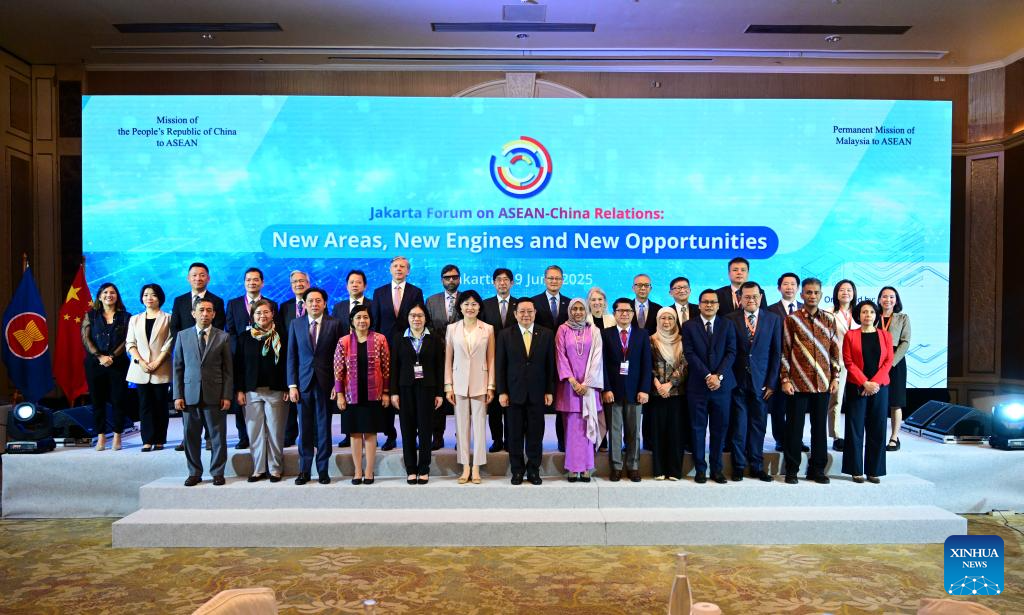Participants pose for a group photo during the Jakarta Forum on ASEAN-China Relations in Jakarta, Indonesia, June 19, 2025. The forum, held under the theme "New Areas, New Engines, New Opportunities" on Thursday, brought together officials, diplomats, and business leaders to explore new paths for inclusive and sustainable growth. (Xinhua/Zulkarnain)