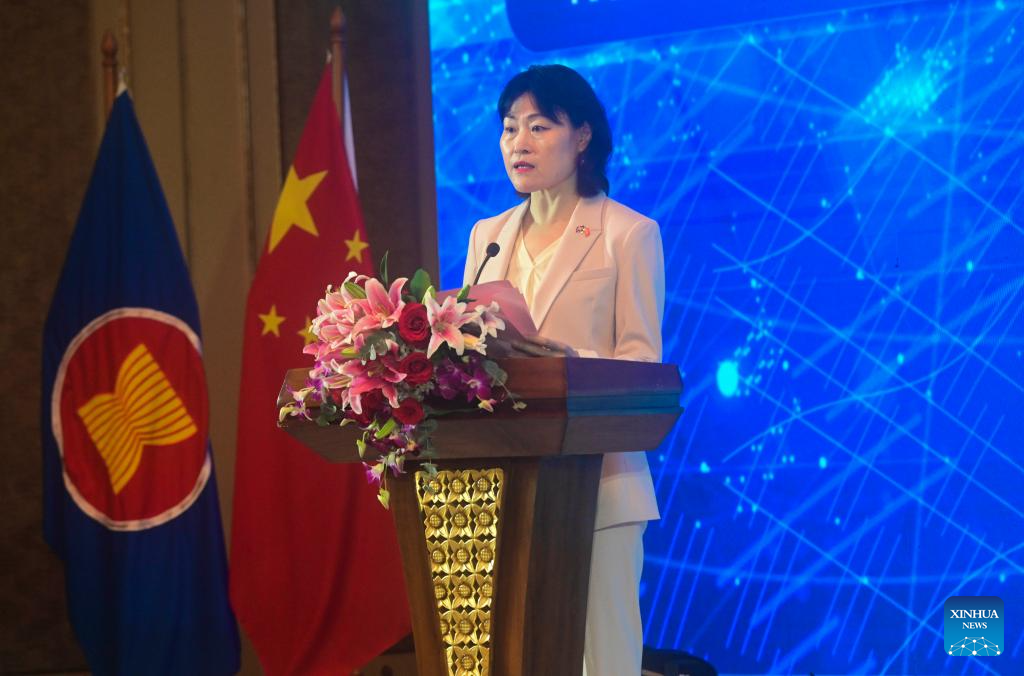Chinese Ambassador to ASEAN Hou Yanqi delivers a speech during the Jakarta Forum on ASEAN-China Relations in Jakarta, Indonesia, June 19, 2025. The forum, held under the theme "New Areas, New Engines, New Opportunities" on Thursday, brought together officials, diplomats, and business leaders to explore new paths for inclusive and sustainable growth. (Xinhua/Zulkarnain)