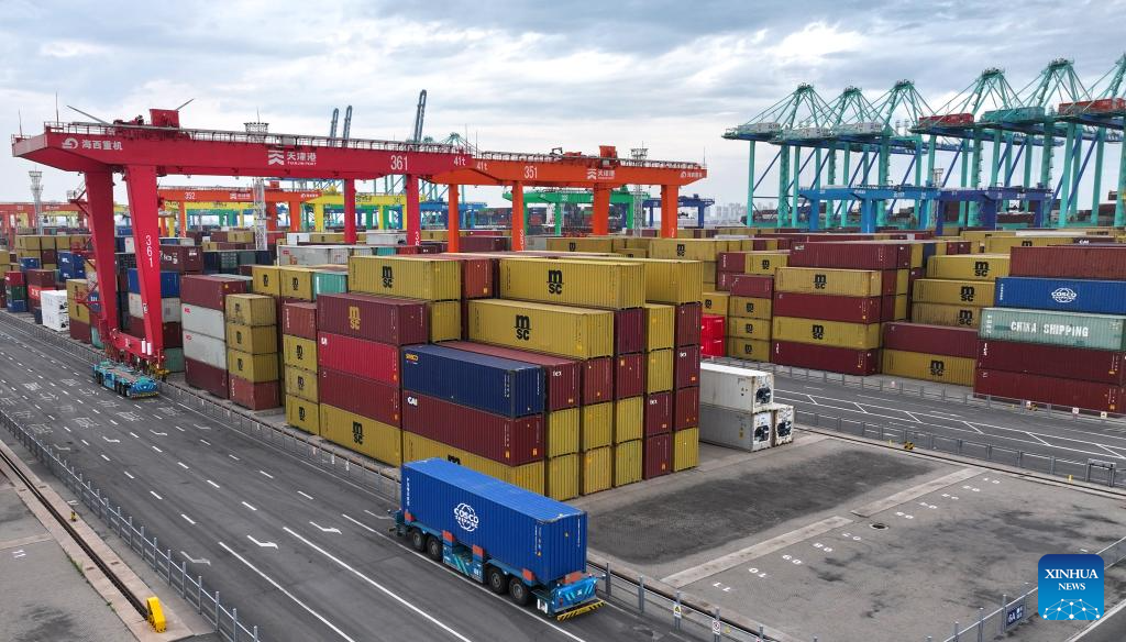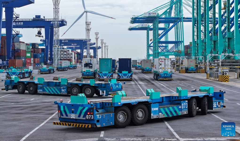 A drone photo taken on June 19, 2025 shows a smart transport robot delivering cargos at a container terminal of Tianjin Port in north China's Tianjin, on June 19, 2025. Tianjin Port has been pursuing full-process automation in recent years in an effort to build a smart and green hub port.